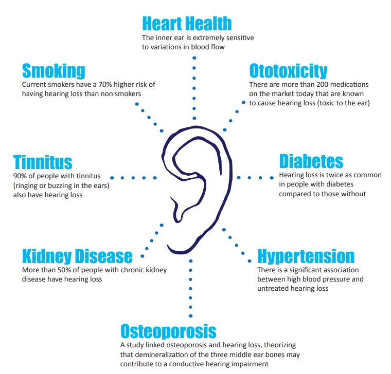 Their are major benefits to seeking regular hearing health care. The hearing system has a strong relationship with our overall health. Individuals with pre-existing health conditions such as diabetes, osteoporosis, heart disease, kidney disease, or tinnitus should have their hearing checked and monitored. Individuals who smoke, or have hypertension are at a higher risk of hearing loss